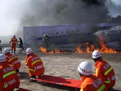 4月18日下午5时30分,天鹰航空公司由乌鲁木齐飞往伊宁的073航班,在伊宁机场降落时冲出跑道造成机翼起火。伊宁机场应急救援指挥中心立即启动应急援救预案,发出紧急出动指令。这是伊宁机场举行的一次“4.18”救援演练。